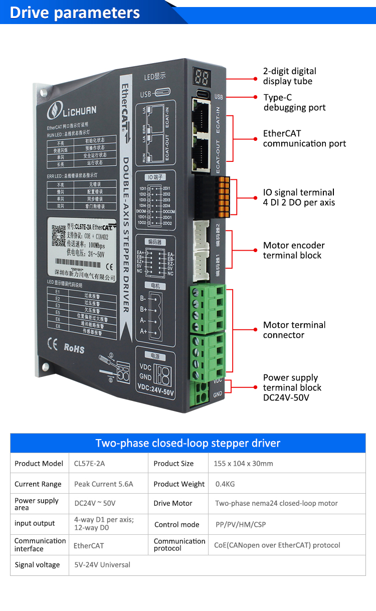 EtherCAT 2Phase Nema23 2 ardatz DC begizta itxia Stepper Motor Driver Kit
