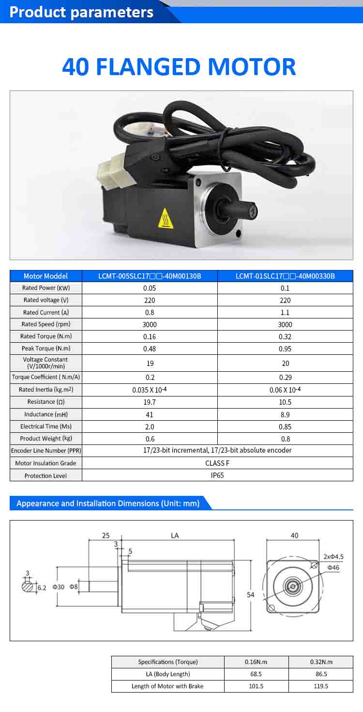 Lichuan AC Servo Motor Drivers Kit A8 Zehaztasun handiko STO ABZ 100W 0.32N.m 220V 1.1A 3000RPM IP65