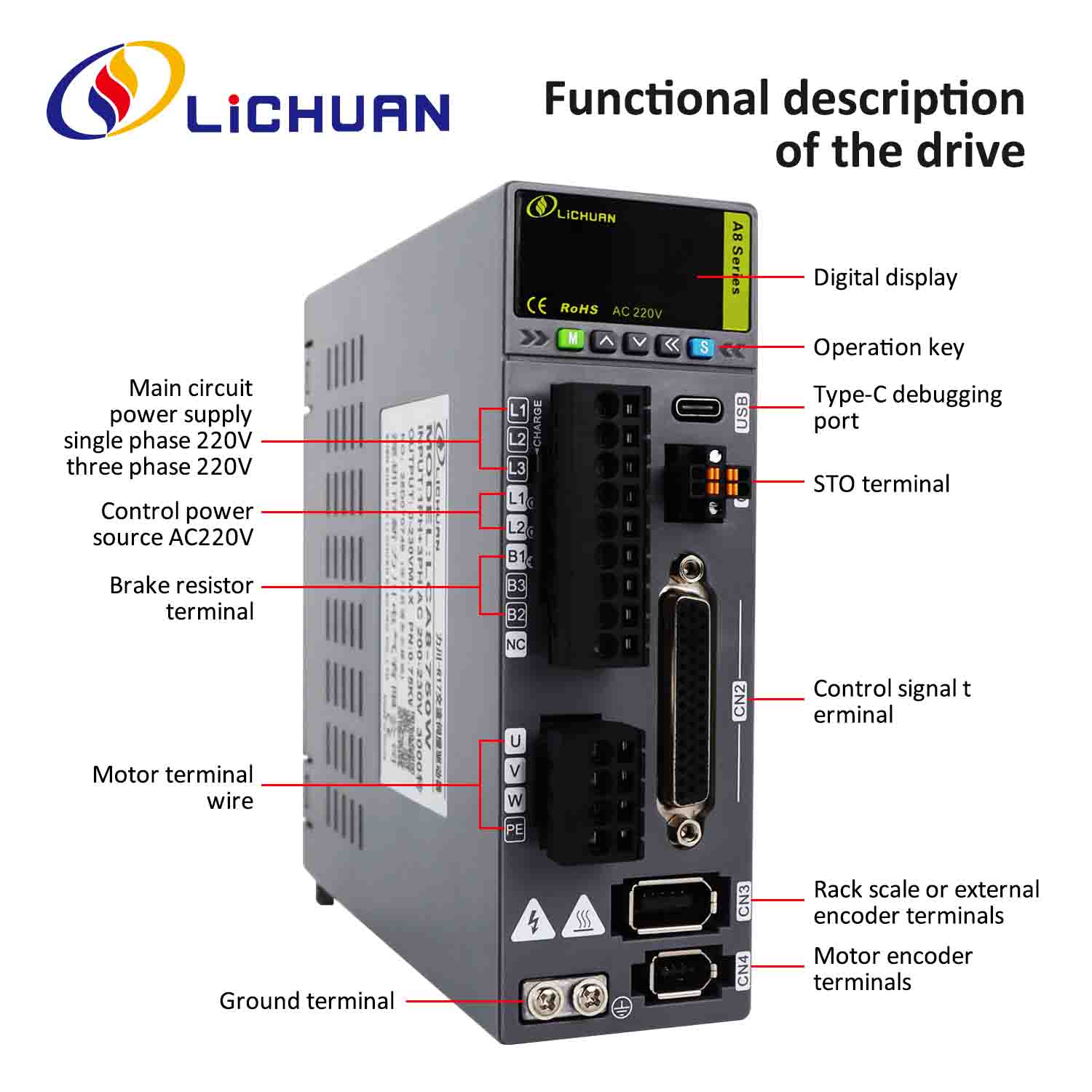 Produktuaren izena:Lichuan A8 Zehaztasun handiko STO ABZ AC Servo Motor Drivers Kit