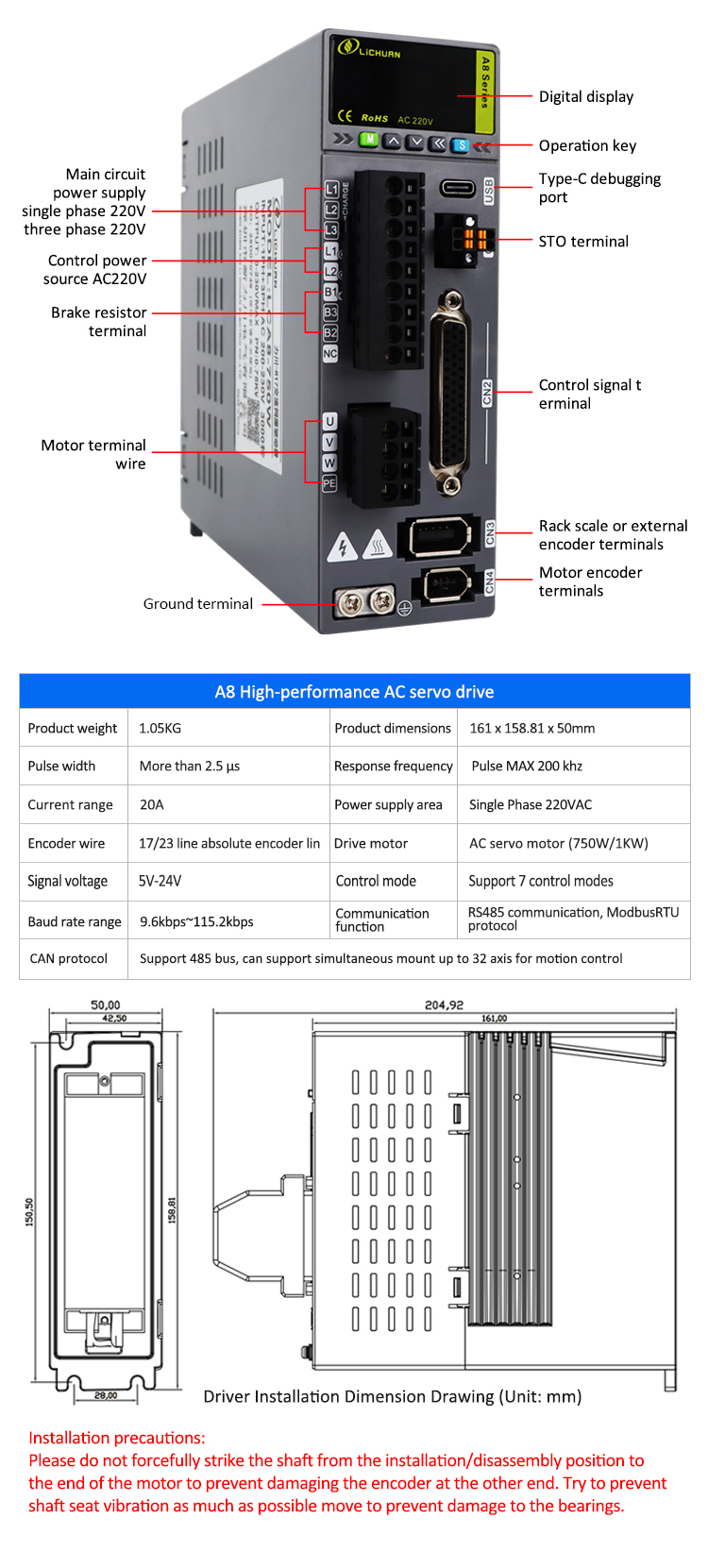 Pulse/RS485 750W/1000W/1001W 2500/3000RPM A8 Zehaztasun handiko STO ABZ AC Servo Motor Drivers Kit